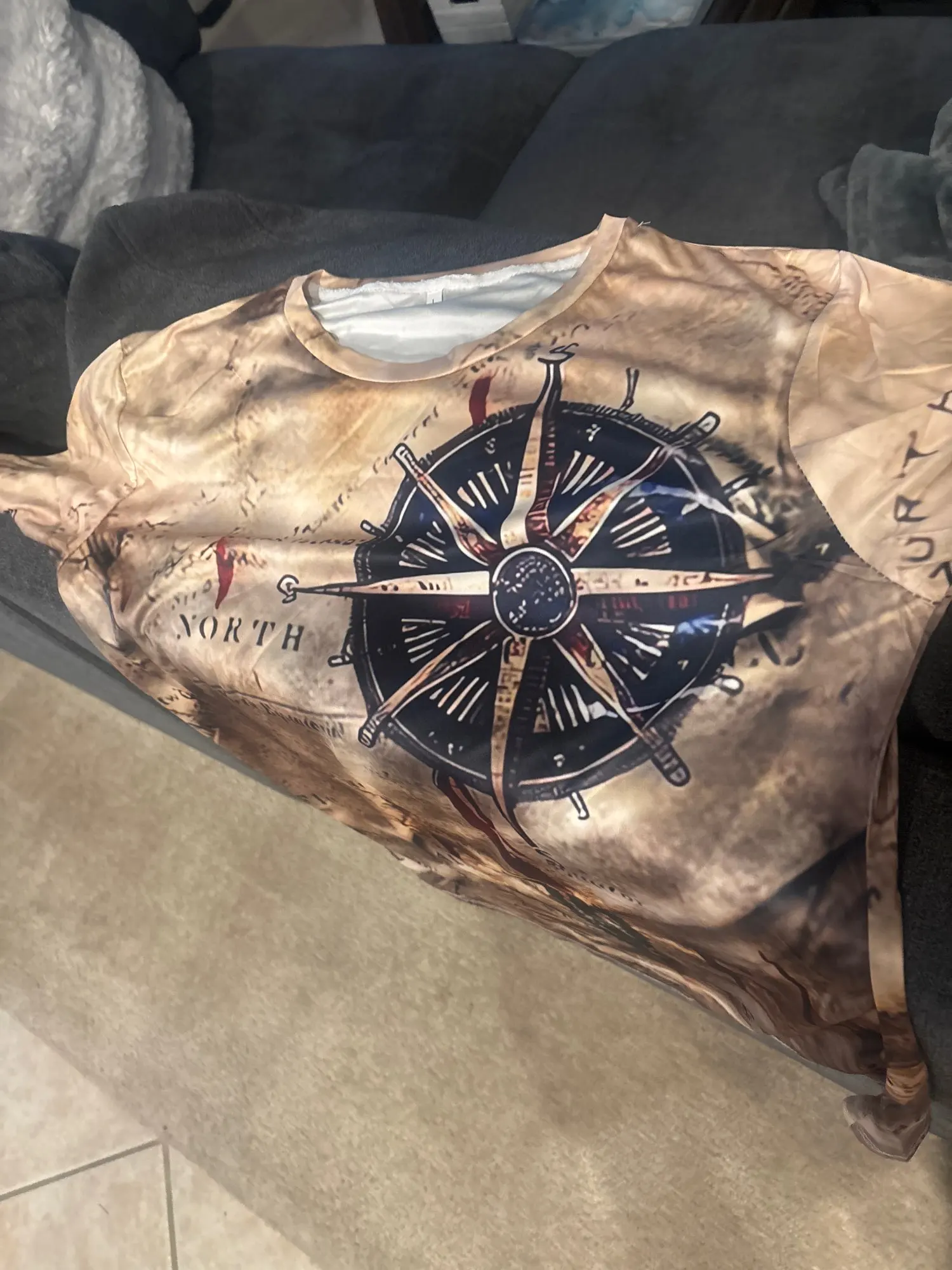 This vintage men's compass print t-shirt offers a classic American streetwear style. It features a relaxed, loose fit, ideal for summer wear. The polyester-spandex blend with jersey broadcloth provides stretch and durability, while its quick-dry properties enhance comfort. A timeless crew neck and short sleeves are paired with a graphic print. The wrinkle-resistant fabric is easy to maintain. This unisex-friendly tee is available in sizes S to 5XL and is suitable for men and women seeking vintage-inspired casual wear.