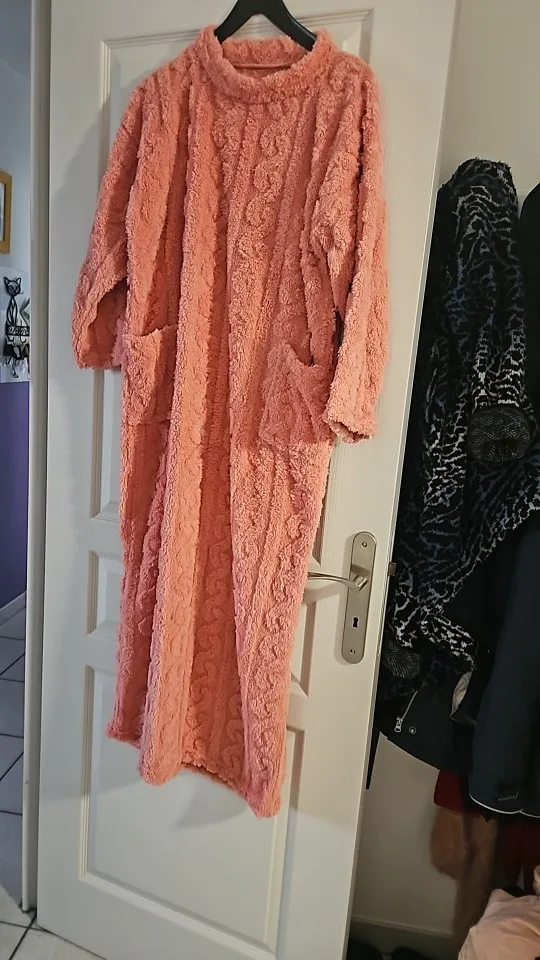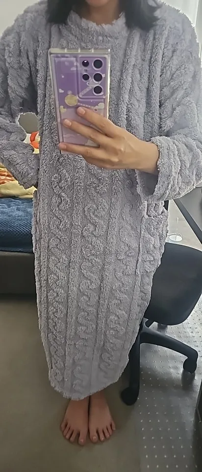Engineered for cold-weather comfort, this women's nightgown combines coral fleece construction with jacquard weaving for enhanced warmth and durability. The thick, insulating fabric provides superior thermal retention throughout winter months, while the mid-calf length offers full coverage and protection. Practical double pockets add functional appeal for everyday convenience. The solid, understated design complements any bedroom aesthetic while maintaining a timeless appeal. Ideal for those prioritizing warmth and comfort during extended cold seasons without compromising on style or practicality.